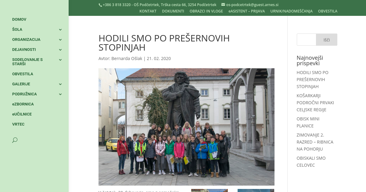 V četrtek, 20. februarja, smo z osmošolci izvedli kulturni dan (Po Prešernovih stopinjah). S sprehajanjem po Prešernovi poti smo pričeli pri Prešernovem spomeniku v Ljubljani in se sprehodili do tistih točk, ki so povezane s Prešernovim življenjem in delom. Nato smo si v Kranju ogledali Prešernov muzej, Prešernov spomenik in gaj, kjer je pesnik pokopan – tu so prav vsi učenci 8. a razreda deklamirali Prešernovo Turjaško Rozamundo; po Prešernovih stopinjah smo zopet hodili v Vrbi, v Prešernovi rojstni hiši, kjer pa so prav vsi učenci 8. b deklamirali Povodnega moža. Ustavili smo se še pri vaški lipi in cerkvici Sv. Marka ter tako poglobili in strnili svoje znanje o obdobju romantike na Slovenskem. Bernarda Ošlak