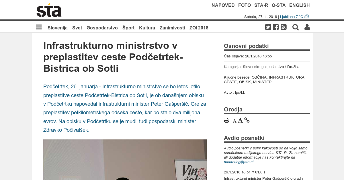 Infrastrukturno ministrstvo se bo letos lotilo preplastitve ceste Podčetrtek-Bistrica ob Sotli, je ob današnjem obisku v Podčetrtku napovedal infrastrukturni minister Peter Gašperšič. Gre za preplastitev petkilometrskega odseka ceste, kar bo stalo dva milijona evrov. Na obisku v Podčetrtku se je mudil tudi gospodarski minister Zdravko Počivalšek.