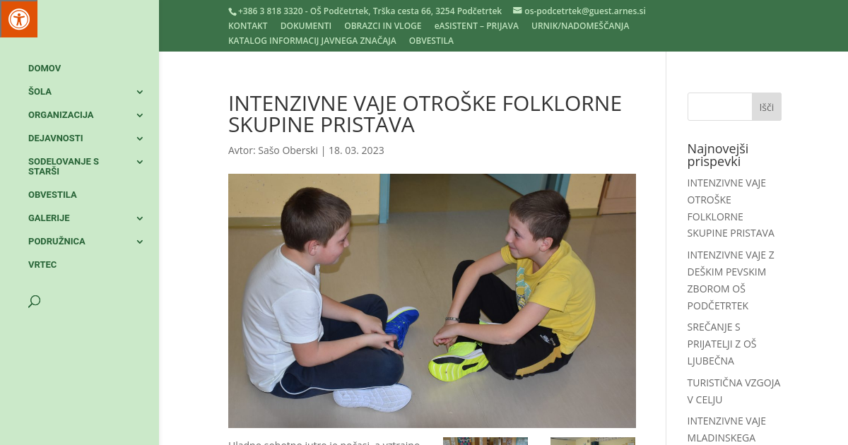 Hladno sobotno jutro je počasi, a vztrajno ogrevalo marčevsko sonce. Tudi folklorniki otroške folklorne skupine Pristava smo pričeli z ogrevanjem. Ob glasbi smo razvijali svojo plesnost in ritem. Naučili smo se novo izštevanko in ples, ponovili že do sedaj naučene plese in sestavljali koreografijo. Na koncu smo bili malce utrujeni, a obrazi nasmejani in veseli, kot se za folklornike spodobi. Koreografijo bomo predstavili na prireditvi ob materinskem dnevu. Prvič pa se bomo udeležili območne revije otroških folklornih skupin. Dragi starši, računamo na vašo podporo.