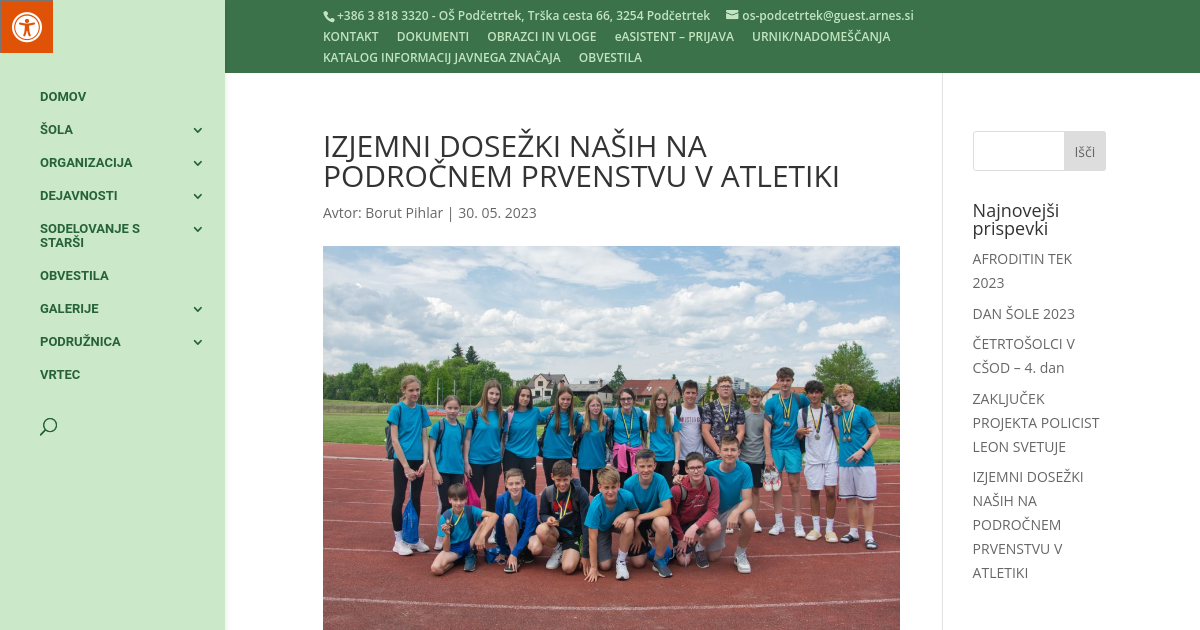 Celje; 30. maj 2023 Na atletskem stadionu Kladivarja v Celju, je danes potekalo področno tekmovanje v atletiki. Naša 23 članska ekipa se je izvrstno odrezala. Osvojili so kar devet medalj,od tega dve zlati, tri srebrne in štiri bronaste. Popravili štiri šolske rekorde, med drugim tudi devetnajst let star rekord štafete 4×100 m pri fantih. Kraljica športa, kot imenujemo atletiko, je prinesla obilo zadovoljstva našim mladim atletom in atletinjam. Glede na odlične rezultate, z nestrpnostjo čakamo na objavo finalistov državnega prvenstva, ki bo 7. junija v Slovenski Bistrici. Iskrene čestitke.