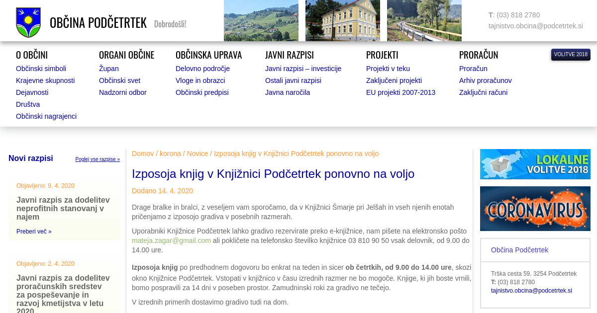 Drage bralke in bralci, z veseljem vam sporočamo, da v Knjižnici Šmarje pri Jelšah in vseh njenih enotah pričenjamo z izposojo gradiva v posebnih razmerah. Uporabniki Knjižnice Podčetrtek lahko gradivo rezervirate preko e-knjižnice, nam pišete na elektronsko pošto mateja.zagar@gmail.com ali pokličete na telefonsko številko knjižnice 03 810 90 50 vsak delovnik, od 9.00 do 14.00