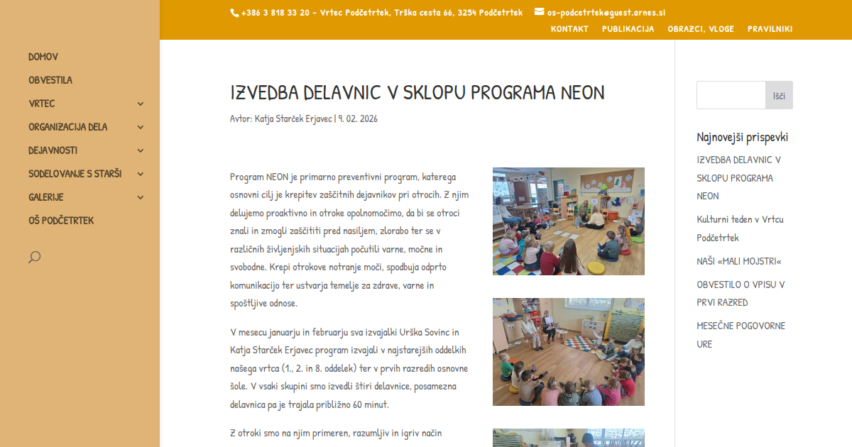 Program NEON je primarno preventivni program, katerega osnovni cilj je krepitev zaščitnih dejavnikov pri otrocih. Z njim delujemo proaktivno in otroke opolnomočimo, da bi se otroci znali in zmogli zaščititi pred nasiljem, zlorabo ter se v različnih življenjskih situacijah počutili varne, močne in svobodne. Krepi otrokove notranje moči, spodbuja odprto komunikacijo ter ustvarja temelje za zdrave, varne in spoštljive odnose.