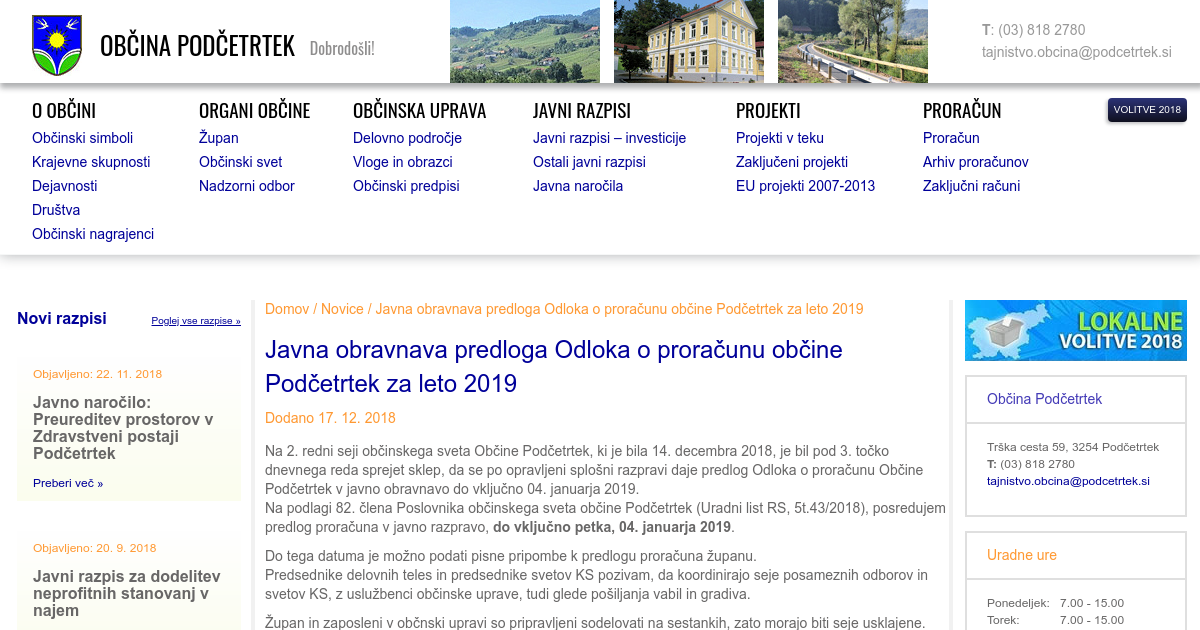 Na 2. redni seji občinskega sveta Občine Podčetrtek, ki je bila 14. decembra 2018, je bil pod 3. točko dnevnega reda sprejet sklep, da se po opravljeni splošni razpravi daje predlog Odloka o proračunu Občine Podčetrtek v javno obravnavo do vključno 04. januarja 2019. Na podlagi 82. člena Poslovnika občinskega sveta občine Podčetrtek (Uradni list