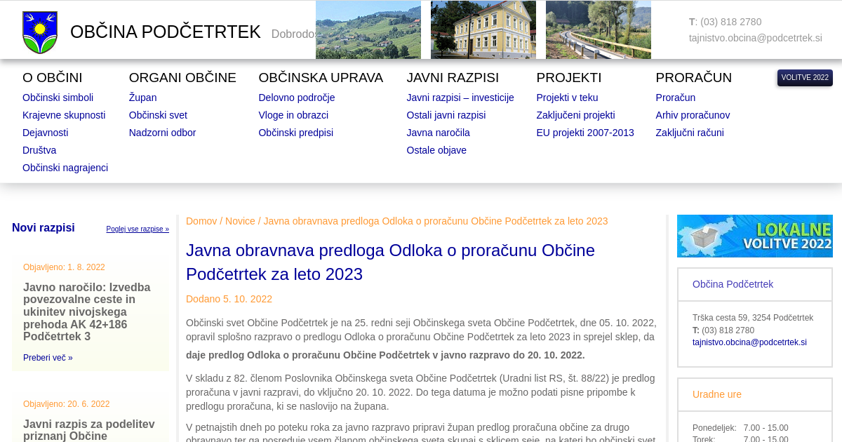 Občinski svet Občine Podčetrtek je na 25. redni seji Občinskega sveta Občine Podčetrtek, dne 05. 10. 2022, opravil splošno razpravo o predlogu Odloka o proračunu Občine Podčetrtek za leto 2023 in sprejel sklep, da daje predlog Odloka o proračunu Občine Podčetrtek v javno razpravo do 20. 10. 2022. V skladu z 82. členom Poslovnika Občinskega