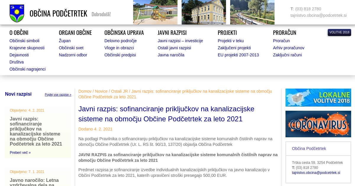 Javni razpis: sofinanciranje priključkov na kanalizacijske sisteme na območju Občine Podčetrtek za leto 2021