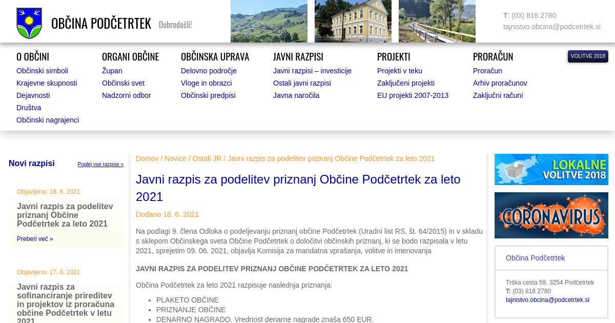 Javni razpis za podelitev priznanj Občine Podčetrtek za leto 2021