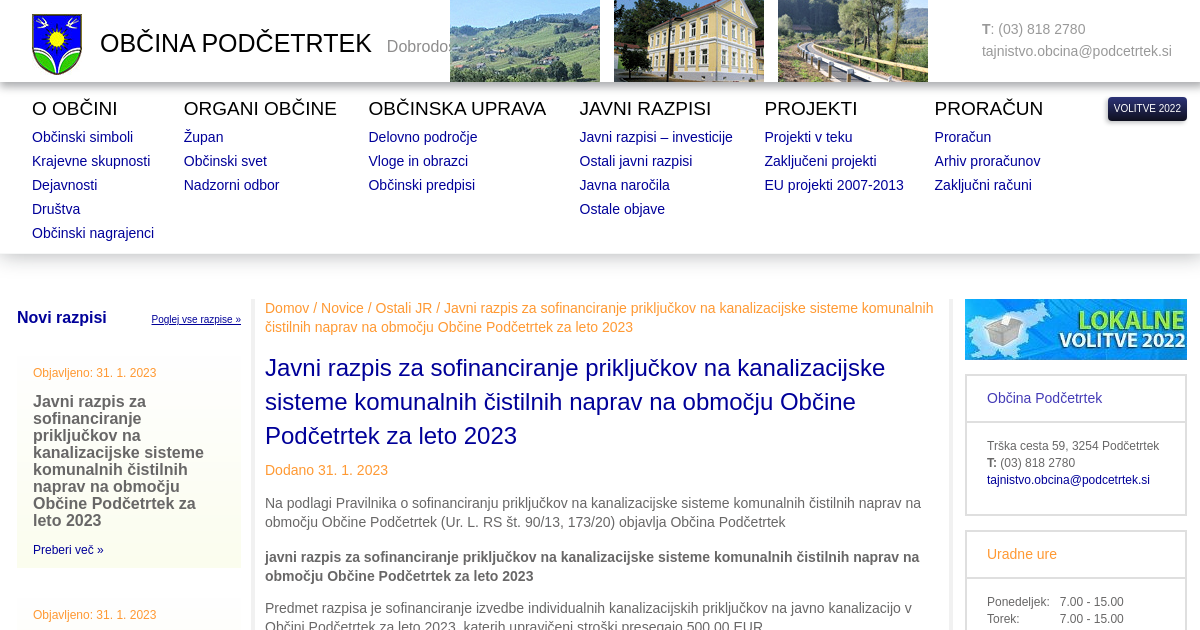 Javni razpis za sofinanciranje priključkov na kanalizacijske sisteme komunalnih čistilnih naprav na območju Občine Podčetrtek za leto 2023