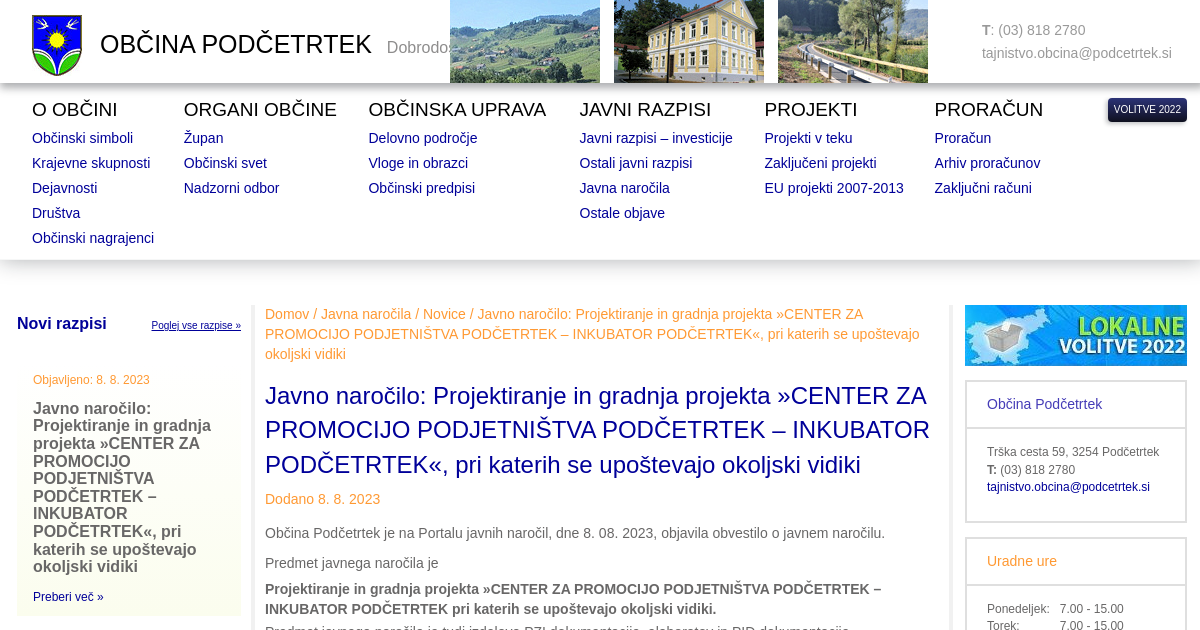 Javno naročilo: Projektiranje in gradnja projekta »CENTER ZA PROMOCIJO PODJETNIŠTVA PODČETRTEK – INKUBATOR PODČETRTEK«, pri katerih se upoštevajo okoljski vidiki