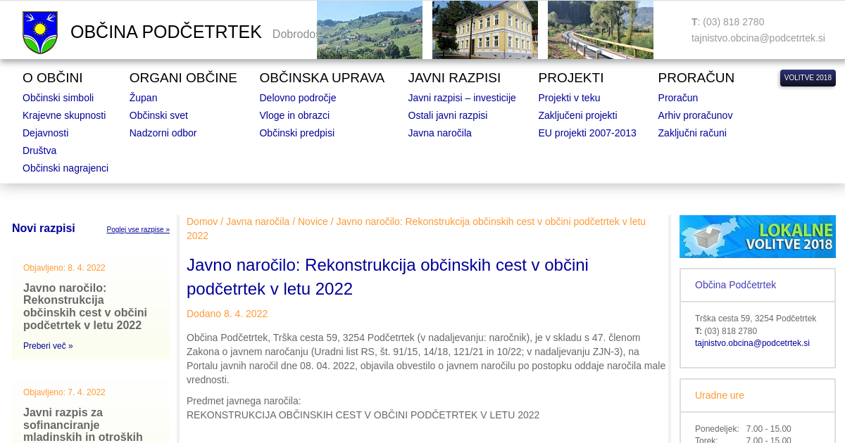 Javno naročilo: Rekonstrukcija občinskih cest v občini podčetrtek v letu 2022