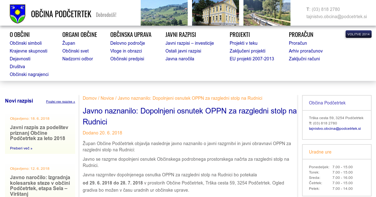 Župan Občine Podčetrtek objavlja naslednje javno naznanilo o javni razgrnitvi in javni obravnavi OPPN za razgledni stolp na Rudnici: Javno se razgrne dopolnjeni osnutek Občinskega podrobnega prostorskega načrta za razgledni stolp na Rudnici. Javna razgrnitev dopolnjenega osnutka OPPN za razgledni stolp na Rudnici bo potekala od 29. 6. 2018 do 28. 7. 2018 v prostorih