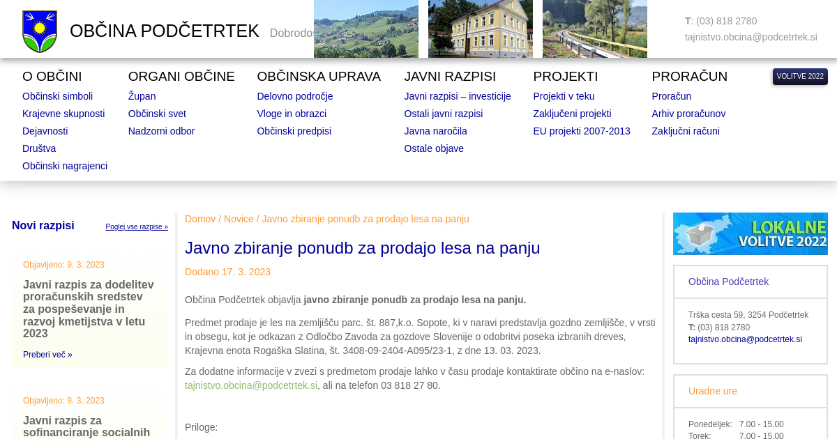 Občina Podčetrtek objavlja javno zbiranje ponudb za prodajo lesa na panju. Predmet prodaje je les na zemljišču parc. št. 887,k.o. Sopote, ki v naravi predstavlja gozdno zemljišče, v vrsti in obsegu, kot je odkazan z Odločbo Zavoda za gozdove Slovenije o odobritvi poseka izbranih dreves, Krajevna enota Rogaška Slatina, št. 3408-09-2404-A095/23-1, z dne 13. 03.