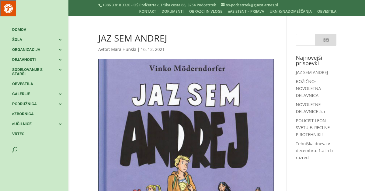 “Rastem s knjigo” je nacionalni projekt spodbujanja bralne kulture, ki skuša osnovnošolce motivirati za branje mladinskega leposlovja slovenskih avtorjev ter jih spodbuditi k obiskovanju splošnih knjižnic. V ta namen je naše sedmošolce v ponedeljek, 13.12. 2021, obiskala knjižničarka iz knjižnice Šmarje pri Jelšah in jim podarila knjige pisatelja Vinka Moderndorferja – Jaz sem Andrej, z ilustracijami Jureta Engelsbergerja. Nas pa že zanima, le kakšen je ta Andrej?