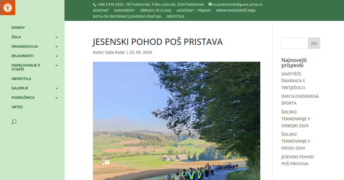 Prvi jesenski dan je bil kot nalašč za obeležitev dneva športa, kajti megleno jutro se je prelevilo v čudovit, s soncem obsijan dan. Z učenci POŠ Pristava smo ta dan izkoristili za pohod, nedaleč stran od šole. Pot nas je vodila od šole proti Nezbišam, kjer smo pri se na polovici poti pri vikendici okrepčali. Učenci so imeli tudi nekaj časa za prosto igro. Nato smo se razdelili in preostanek poti prehodili v dveh skupinah. 1. in 2. razred so pot nadaljevali po Nezbišah in zadnji del poti proti šoli po pločniku proti Pristavi; 3., 4. in 5. razred pa so krenili proti Jerčinu in jerčinski dolini ter se priključili na pločnik proti Pristavi. V šolo smo prišli malce utrujeni, vendar še vedno polni pozitivne energije.