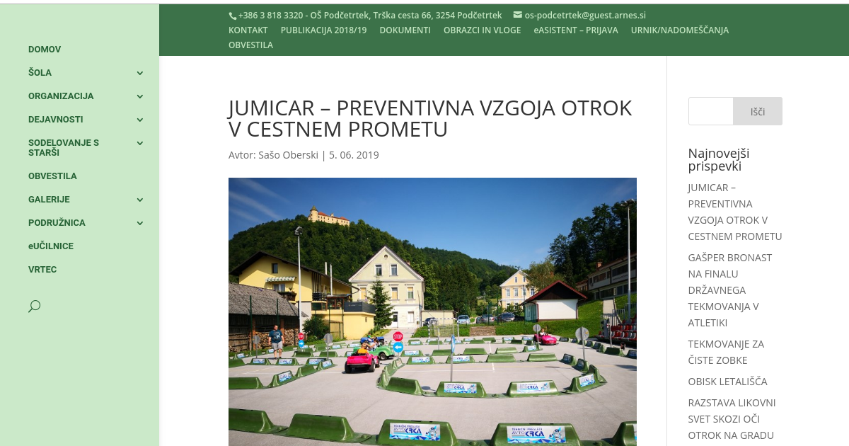Učenci 4. in 5. razreda matične in podružnične šole so sodelovali v programu JUMICAR. Program poučuje učence, kako se vesti v prometnem okolju. Učenci so postavljeni v vlogo voznika in doživljajo dogodke, kot jih opaža in zaznava voznik v pravem prometu. Spoznali so, kako jih vidi voznik, kako težko je včasih ustaviti, kako je pomemben varnostni pas, predvsem pa, da se voznik kljub previdnosti včasih ne more pravočasno odzvati, če se učenci neprevidno in nepričakovano vključijo v promet. Program JUMICAR podpira Svet za preventivo in vzgojo v cestnem prometu, Generalna policijska uprava in Policijska akademija, izvedbo programa pa je omogočila občina Podčetrtek.