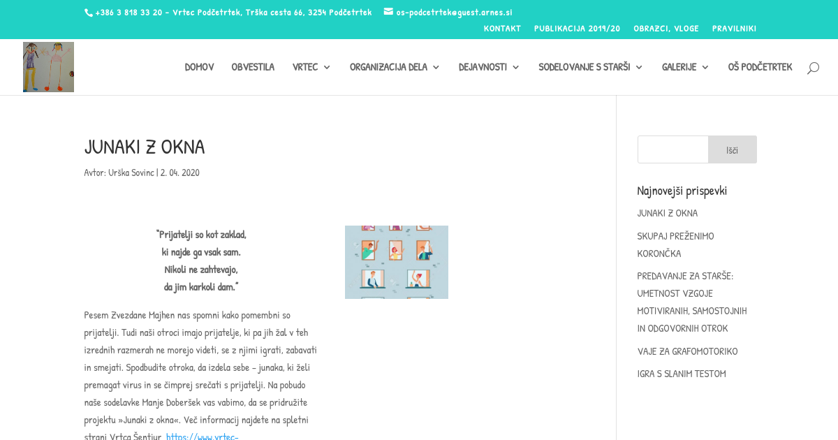 Pesem Zvezdane Majhen nas spomni kako pomembni so prijatelji. Tudi naši otroci imajo prijatelje, ki pa jih žal v teh izrednih razmerah ne morejo videti, se z njimi igrati, zabavati in smejati. Spodbudite otroka, da izdela sebe – junaka, ki želi premagat virus in se čimprej srečati s prijatelji. Na pobudo naše sodelavke Manje Doberšek vas vabimo, da se pridružite projektu »Junaki z okna«. Več informacij najdete na spletni strani Vrtca Šentjur https://www.vrtec-sentjur.si/2020/03/30/junaki-z-okna/.