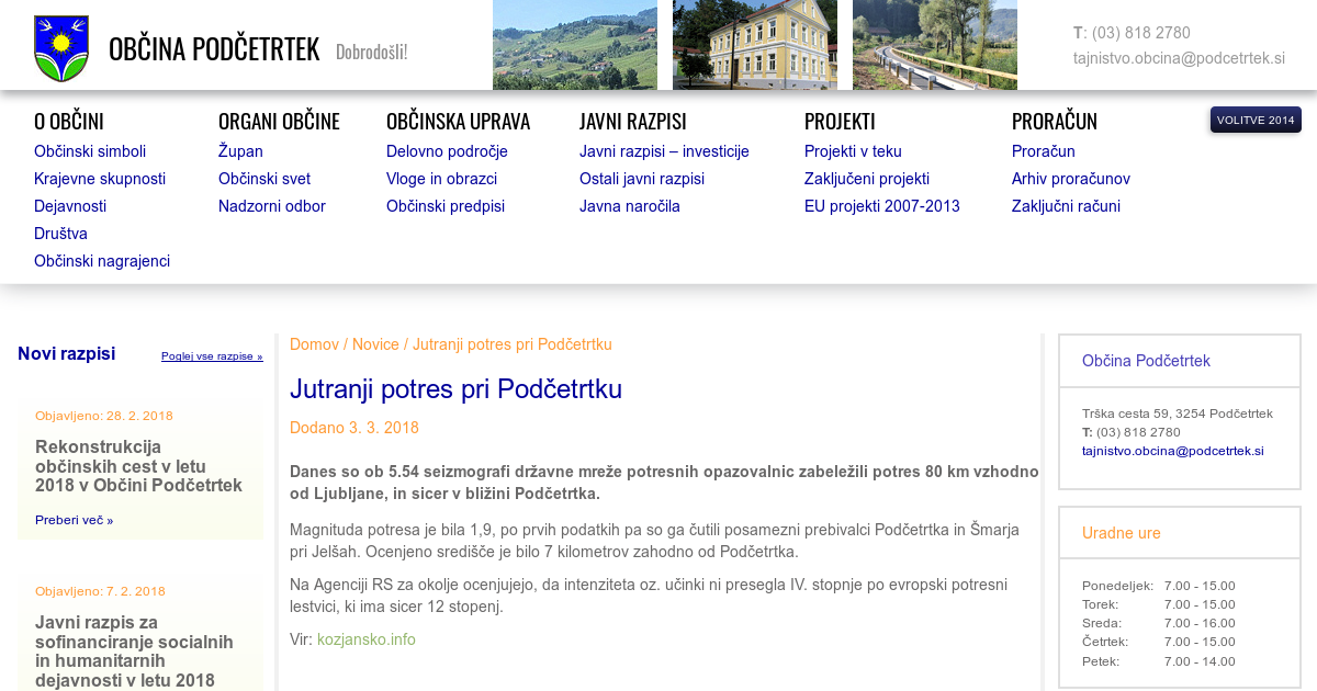 Danes so ob 5.54 seizmografi državne mreže potresnih opazovalnic zabeležili potres 80 km vzhodno od Ljubljane, in sicer v bližini Podčetrtka. Magnituda potresa je bila 1,9, po prvih podatkih pa so ga čutili posamezni prebivalci Podčetrtka in Šmarja pri Jelšah. Ocenjeno središče je bilo 7 kilometrov zahodno od Podčetrtka. Na Agenciji RS za okolje ocenjujejo, da intenziteta