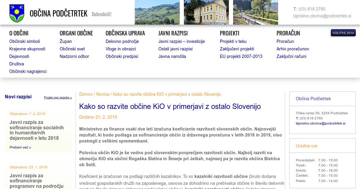 Ministrstvo za finance vsaki dve leti izračuna koeficiente razvitosti slovenskih občin. Najnovejši rezultati, ki bodo podlaga za sofinanciranje občin iz državnega proračuna v letih 2018 in 2019, niso postregli z velikimi spremembami. Polovica občin KiO je še vedno pod slovenskim povprečjem razvitosti občin. Najbolj razviti na območju KiO sta občini Rogaška Slatina in Šmarje pri