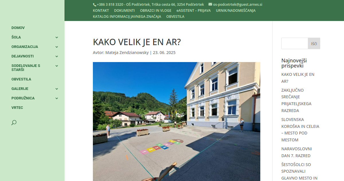 V četrtek, 19. junija 2025, so imeli šestošolci tehniški dan z naslovom Merjenje in obdelava podatkov. Z merilnimi trakovi in različnimi nalogami v zvezi z merjenjem osnovnih količin so se podali v okolico šole, kjer so merili dolžine, širine in višine različnih predmetov ter čas in maso. Največji izziv jim je predstavljalo predhodno ocenjevanje merskih količin, predvsem mase. Nato so računali velikosti različnih ploskev, najbolj všeč pa jim je bilo, ko so pred šolo zakoličili površino veliko en ar ter ugotovili, da je šolsko igrišče veliko približno 9 arov.