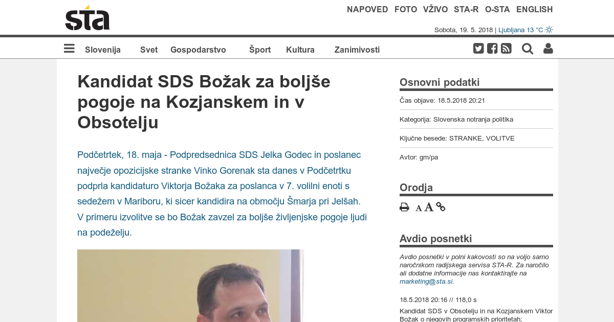 Podpredsednica SDS Jelka Godec in poslanec največje opozicijske stranke Vinko Gorenak sta danes v Podčetrtku podprla kandidaturo Viktorja Božaka za poslanca v 7. volilni enoti s sedežem v Mariboru, ki sicer kandidira na območju Šmarja pri Jelšah. V primeru izvolitve se bo Božak zavzel za boljše življenjske pogoje ljudi na podeželju.