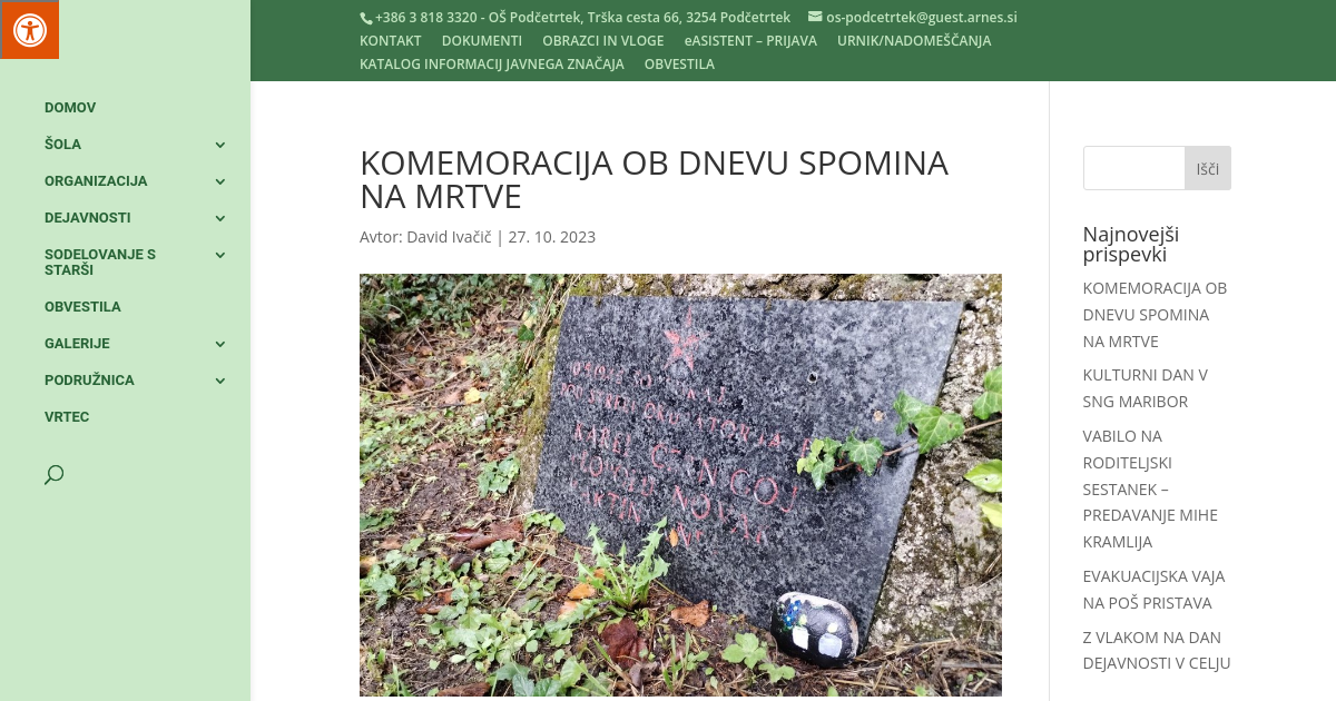 Učenci razredne stopnje OŠ Podčetrtek smo s komemoracijo počastili dan spomina na mrtve. Pridružili so se nam tudi učenci in učenke III. OŠ Rogaška Slatina. S priložnostnimi deklamacijami so nastopile učenke 4. in 5. razreda. Z deklamacijami smo obudili spomin na naše najdražje in vse tiste, ki so dali življenja za našo domovino. Zaradi slabega vremena je kratka prireditev potekala v šoli. Predstavniki razredov smo po prireditvi obiskali spomenik treh talcev, kjer smo “prižgali” eko svečko, ki so jo izdelali učenci 5. razreda.