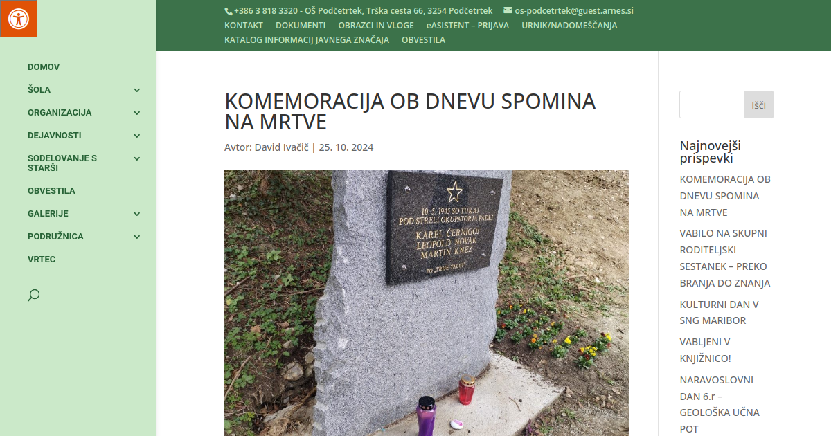 Učenci OŠ Podčetrtek smo s komemoracijo počastili dan spomina na mrtve. Obiskali smo obnovljen spomenik treh talcev v gozdičku nad šolo. Učenci četrtih razredov so nastopili s priložnostno pesmijo. Program pa so obogatili še učenci ostalih razredov z deklamacijami in učenka višje stopnje z violino. Program je povezovala petošolka.