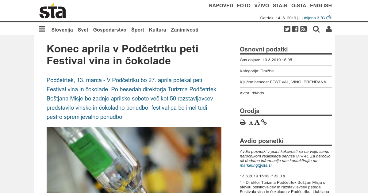 V Podčetrtku bo 27. aprila potekal peti Festival vina in čokolade. Po besedah direktorja Turizma Podčetrtek Boštjana Misje bo zadnjo aprilsko soboto več kot 50 razstavljavcev predstavilo vinsko in čokoladno ponudbo, festival pa bo imel tudi pestro spremljevalno ponudbo.