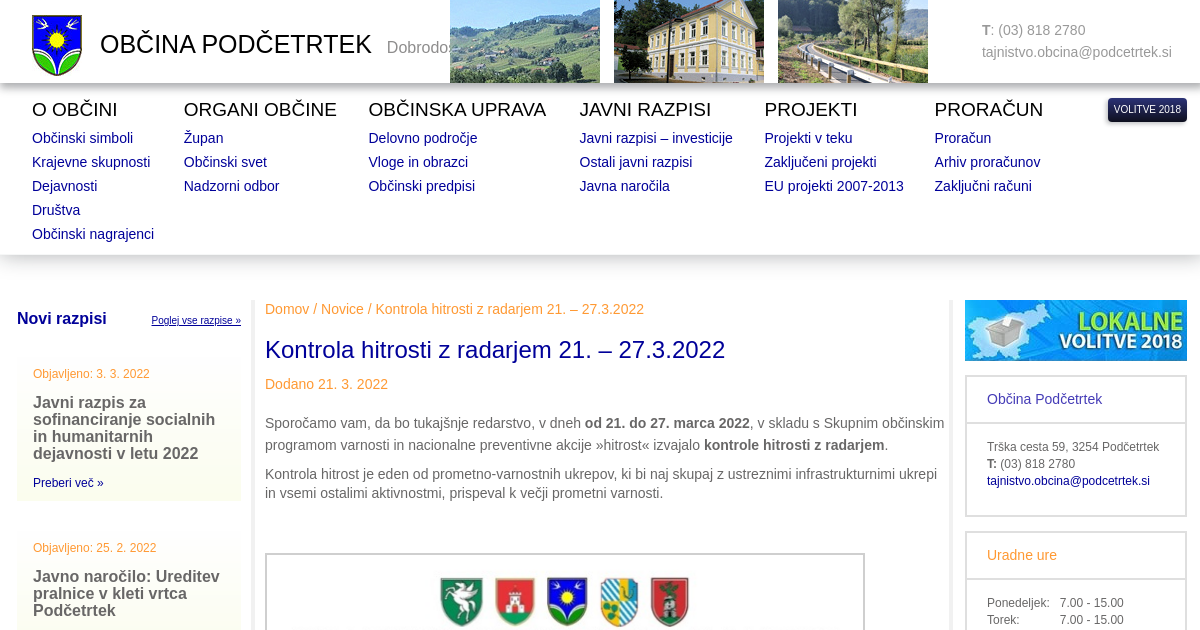 Sporočamo vam, da bo tukajšnje redarstvo, v dneh od 21. do 27. marca 2022, v skladu s Skupnim občinskim programom varnosti in nacionalne preventivne akcije »hitrost« izvajalo kontrole hitrosti z radarjem. Kontrola hitrost je eden od prometno-varnostnih ukrepov, ki bi naj skupaj z ustreznimi infrastrukturnimi ukrepi in vsemi ostalimi aktivnostmi, prispeval k večji prometni varnosti.