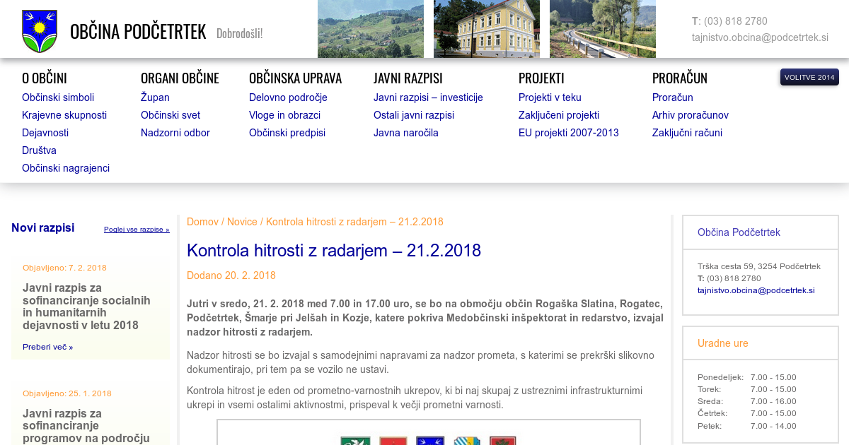 Jutri v sredo, 21. 2. 2018 med 7.00 in 17.00 uro, se bo na območju občin Rogaška Slatina, Rogatec, Podčetrtek, Šmarje pri Jelšah in Kozje, katere pokriva Medobčinski inšpektorat in redarstvo, izvajal nadzor hitrosti z radarjem. Nadzor hitrosti se bo izvajal s samodejnimi napravami za nadzor prometa, s katerimi se prekrški slikovno dokumentirajo, pri tem pa se