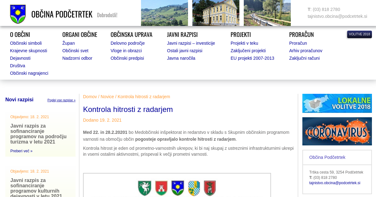 Med 22. in 28.2.20201 bo Medobčinski inšpektorat in redarstvo v skladu s Skupnim občinskim programom varnosti na območju občin pogosteje opravljalo kontrole hitrosti z radarjem. Kontrola hitrost je eden od prometno-varnostnih ukrepov, ki bi naj skupaj z ustreznimi infrastrukturnimi ukrepi in vsemi ostalimi aktivnostmi, prispeval k večji prometni varnosti.
