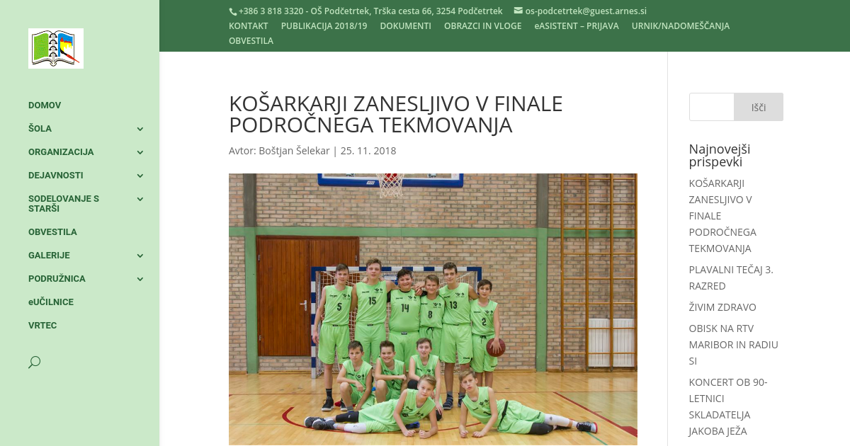 Naša šola je bila gostiteljica polfinalnega turnirja v košarki za starejše učence. Na tekmovanju so poleg naših učencev nastopili še košarkarji iz OŠ Ljubečna in OŠ Ob Dravinji. V finale sta vodili prvi dve mesti. Učenci naše šole so bili v prvi tekmi zanesljivi in s 45:23 premagali OŠ Ljubečna. V drugi tekmi so nato Konjičani ugnali Ljubečno, tako da je o prvem mestu odločala zadnja tekma med Podčetrtkom in šolo iz Slovenskih Konjic. Tretje srečanje je bilo zelo zanimivo, zmagovalca pa je odločila zadnja tretjina, ko so naši košarkarji zaigrali bolj zavzeto v napadu in odločili zmagovalca. Končnih 38:31 za domače je pomenilo prvo mesto in uvrstitev na finalni turnir področnega tekmovanja, ki ga bodo čez slaba dva tedna gostili na OŠ Šmarje pri Jelšah.