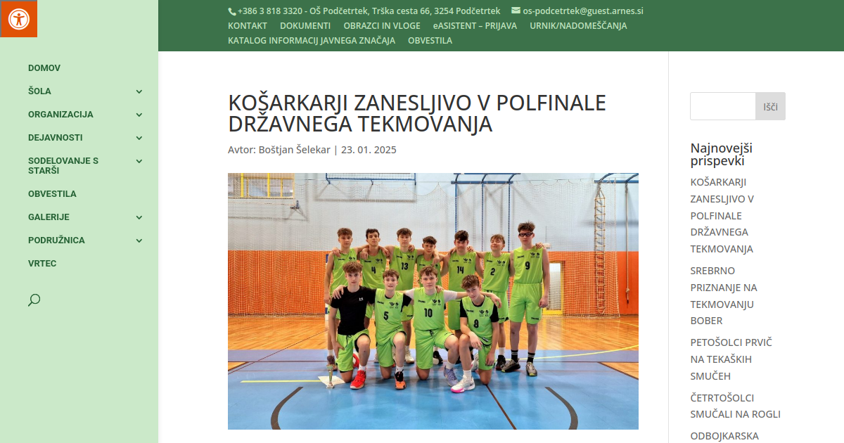 Preko medobčinskega in področnega tekmovanja celjske regije so se naši košarkarji prebili med 36 najboljših šol v državi. Na Prevaljah jih je tako čakal četrtfinalni turnir državnega tekmovanja Košarkarski Superšolar, kjer so bili njihovi nasprotniki prvaki podravske in koroške regije. V prvi tekmi so našim šolarjem nasproti stali učenci OŠ Ludvika Pliberška iz Maribora. Ekipa je pokazala letošnjo najboljšo predstavo in lažje od pričakovanj premagala nasprotnike s 54:36. Tudi na drugi tekmi so naši fantje bili razpoložen in z rezultatom 51:38 ugnali domačo šolo OŠ Franja Goloba Prevalje in se s tem uvrstili v polfinale državnega tekmovanja, kjer bo naša ekipa poizkušala napredovati med 8 najboljših šolskih košarkarskih ekip v državi.