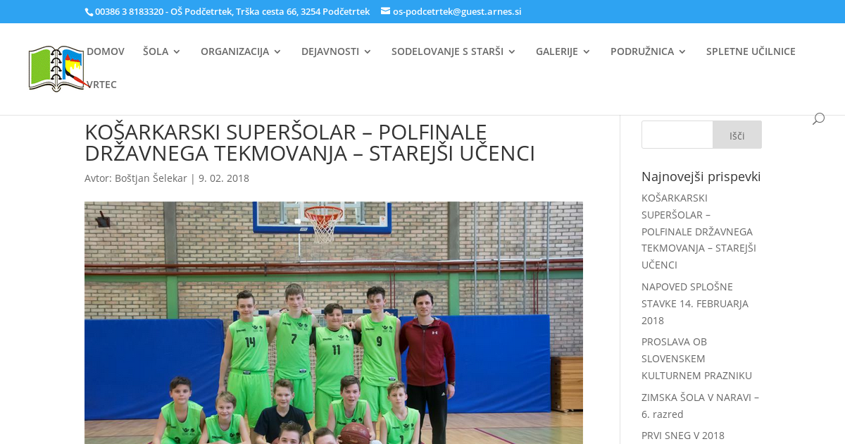 V sredo, 7. 2. 2018, smo na naši osnovni šoli gostili polfinale državnega tekmovanja v košarki za starejše učence. Poleg naših šolarjev so na turnirju nastopili še vrstniki iz OŠ Jurija Dalmatina Krško in sosedi iz II. OŠ Rogaška Slatina. Naši košarkarji so se enkrat več dokazali svoje kvalitete in se z dvema zmagama uvrstili med osem najboljših šol v državi.