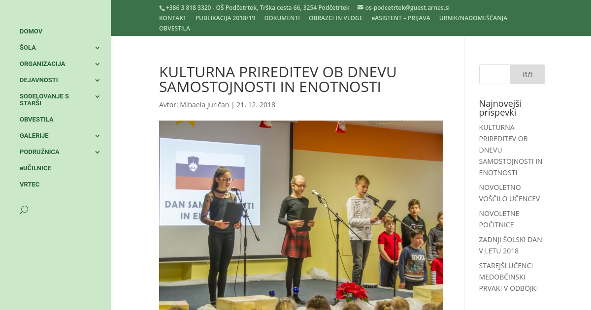 V petek, 21. 12. 2018, smo za vse učence OŠ Podčetrtek in POŠ Pristava pri Mestinju pripravili proslavo v počastitev dneva samostojnosti in enotnosti. V kulturnem programu, kjer smo posebno pozornost namenili pomenu enotnosti in razmišljanju o naši domovini nekoč in danes, smo počastili Cankarjevo leto z recitacijami iz njegovih del. V video prispevku pa so nam učenci 9. razreda zaupali, kaj njim predstavlja domovina, enotnost in ponos. Domoljubje se kaže tudi v pesmi in plesu, kar so nam s svojimi pevskimi, glasbenimi in plesnimi nastopi dokazali učenci 1. in 5. razreda ter deški pevski zbor ob spremstvu učenk višje stopnje. Po praznično obarvanem nagovoru gospe ravnateljice so svoja voščila dodali še učenci 4. razreda. Veselim praznovanjem, ki so pred nami, smo odprli vrata v prazničnem duhu, saj je po končani prireditvi sledilo druženje učencev nižje stopnje po razredih, učenci višje stopnje pa so si v Rogaški Slatini ogledali še kino predstavo Gajin svet.