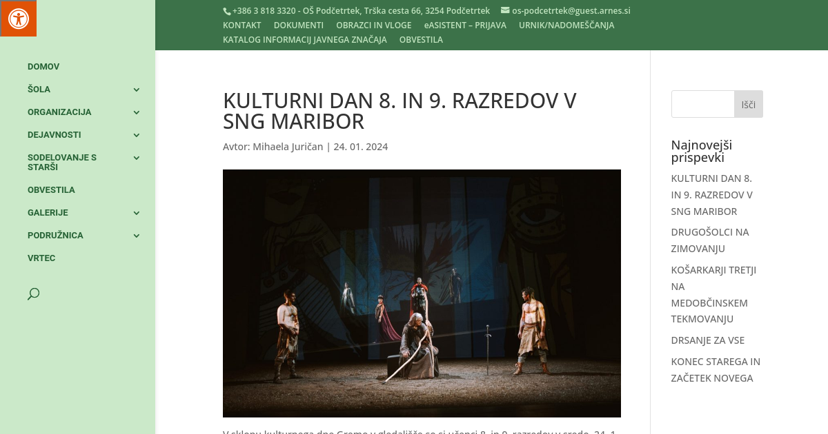 V sklopu kulturnega dne Gremo v gledališče so si učenci 8. in 9. razredov v sredo, 24. 1. 2024, ogledali povsem svežo dramsko uprizoritev priredbe slovenskega romana Pod svobodnim soncem. Veliko slovensko zgodovinsko epopejo o boju majhnega ljudstva za svobodo in ljubezen je pred dobrim stoletjem napisal Fran Saleški Finžgar in je od takrat doživela mnoge tako literarne kot tudi gledališke in radijske priredbe. Pod tokratno sodobno interpretacijo mita, ki je vsebovala preplet izkušenj iz preteklosti in doživljanja sedanjosti, se je podpisal Goran Vojnović. Dogajanje v predstavi, ki je nastala v koprodukciji Drame SNG Maribor, SNG Nova Gorica in Cankarjevega doma Ljubljana, je sicer postavljeno v preteklost, vendar z aktualizacijo in vključevanjem različnih sodobnih vizualnih in zvočnih učinkov spodbuja miselne igre in odpira vprašanja, ki si jih je moč postaviti tudi danes.
