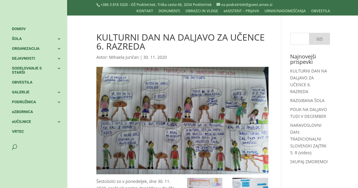 Šestošolci so v ponedeljek, dne 30. 11. 2020, preživeli pestro dopoldne v družbi znanih pravljičnih junakov – Rdeče kapice, hudobnega volka, Trnuljčice, kralja Matjaža idr. Poslušali so radijski igri slovenskega pisatelja Žarka Petana Obtoženi volk in Zaspana Trnuljčica in krmežljavi Matjažek. Prva govori o tem, kako so na sodišču sodili volku iz pravljice o Rdeči kapici, drugi igri pa bi lahko rekli »pravljica o zaspancih«, saj v njej nastopata Trnuljčica in kralj Matjaž. Igri sta nastali v produkciji uredništva igranega programa Radia Slovenija, kjer so zapisali: »Za Petanove pravljice so po večini značilne premene znanih pravljičnih zgodb, v katerih nemalokrat odpira zanj značilne družbenokritične poglede. A na način, da jih mladi poslušalec sprejme skozi igro, odrasli pa v njih prepozna tudi širši ali globlji sporočilni kontekst.« Učenci so po poslušanju poustvarjali. Del kulturnega dne je bil namenjen tudi izjemni slovenski ilustratorki Marlenki Stupica, učenci so jo spoznali ob ogledu kratkega predstavitvenega filma, ki je nastal leta 2013, ko je ilustratorka prejela Prešernovo nagrado za življenjsko delo. Ob kakovostnih vsebinah so se učenci zabavali in usvajali nova znanja.