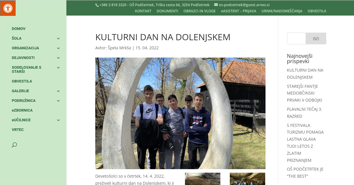 Devetošolci so v četrtek, 14. 4. 2022, preživeli kulturni dan na Dolenjskem, ki ji bil organiziran v okviru CŠOD. Ogledali smo si Krško jamo (izvir reke Krke). Obiskali Trubarjevo domačijo v Rašici, kjer smo spoznavali in nadgrajevali svoje znanje o slovenskem reformatorju Trubarju in njegovih sodobnikih, in vasico Muljava, kjer se je rodil pisatelj Josip Jurčič. Jurčičevo rojstno hišo je postavil pisateljev ded in do danes ni bila spremenjena, je značilna kmečka hiša 19 stol. Blizu hiše stoji Krjavljeva koča. Gre za bogat etnografski muzej na prostem. Na Jurčičevi in Trubarjevi domačiji se srečujejo različne naravne danosti in mnoga področja človeške ustvarjalnosti.