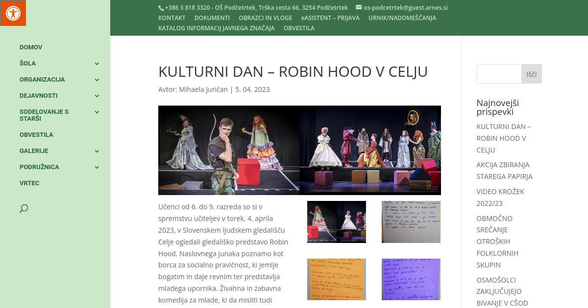 Učenci od 6. do 9. razreda so si v spremstvu učiteljev v torek, 4. aprila 2023, v Slovenskem ljudskem gledališču Celje ogledali gledališko predstavo Robin Hood. Naslovnega junaka poznamo kot borca za socialno pravičnost, ki jemlje bogatim in daje revnim ter predstavlja mladega upornika. Živahna in zabavna komedija za mlade, ki da misliti tudi starejšim, je z veliko besednega humorja in situacijske komike hitro spravila publiko v dobro voljo. Učenci so dobili priložnost soustvarjati predstavo z mahanjem z zastavicami ter lovljenjem “zlatnikov” in kapljic “dežja”, kar jih je sodeč po zapisanih vtisih, ki so jih strnili po vrnitvi v šolo, zelo zabavalo.
