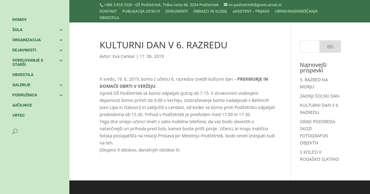 V sredo, 19. 6. 2019, bomo z učenci 6. razredov izvedli kulturni dan – PREKMURJE IN DOMAČE OBRTI V VERŽEJU. Izpred OŠ Podčetrtek se bomo odpeljali zjutraj ob 7.15. S strokovnim vodenjem dejavnosti bomo pričeli ob 9.00 v Veržeju, izobraževanje bomo nadaljevali v Beltincih (vasi Lipa in Ižakovci) in zaključili v Lendavi, od koder se bomo proti Podčetrtku odpeljali predvidoma ob 15.30. Prihod v Podčetrtek je predviden med 17.00 in 17.30. Tega dne smejo učenci imeti s sabo mobilne telefone, da vas bodo obvestili o natančnejši uri prihoda pred šolo, kamor boste prišli ponje. Učenci, ki imajo matična šolska postajališča na relaciji Pristava pri Mestinju–Podčetrtek, bodo smeli izstopati tudi na teh.