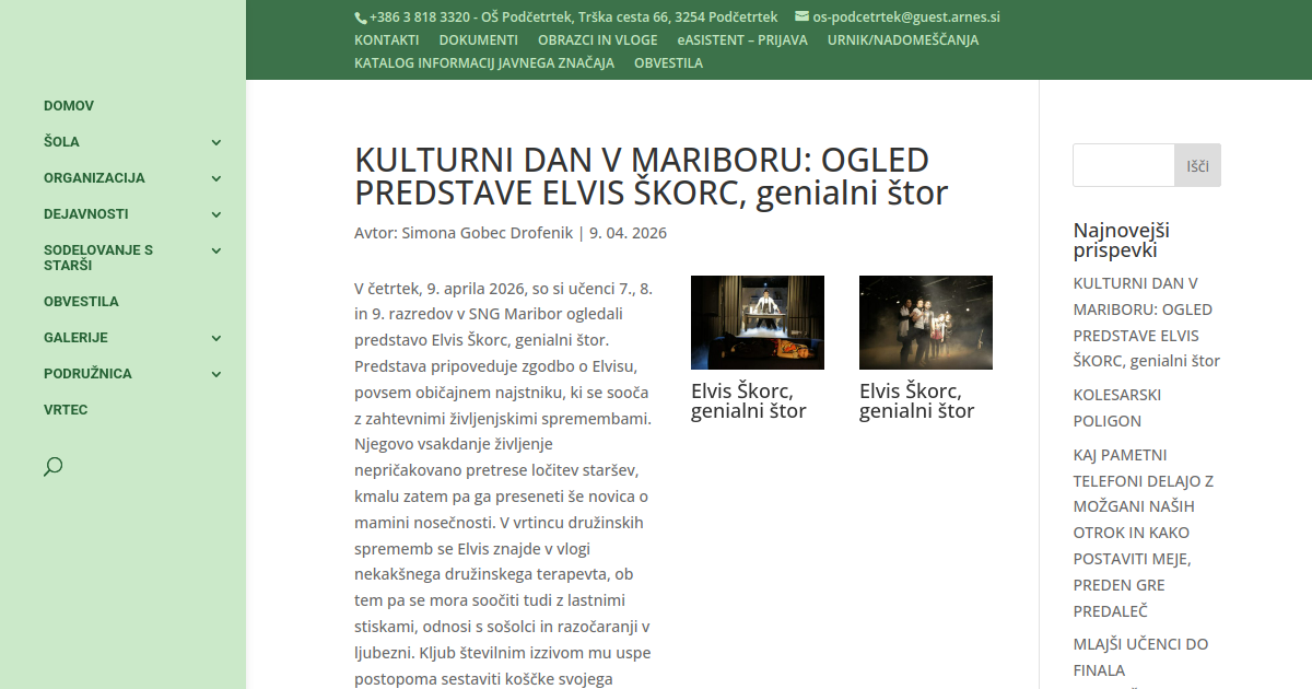 V četrtek, 9. aprila 2026, so si učenci 7., 8. in 9. razredov v SNG Maribor ogledali predstavo Elvis Škorc, genialni štor. Predstava pripoveduje zgodbo o Elvisu, povsem običajnem najstniku, ki se sooča z zahtevnimi življenjskimi spremembami. Njegovo vsakdanje življenje nepričakovano pretrese ločitev staršev, kmalu zatem pa ga preseneti še novica o mamini nosečnosti. V vrtincu družinskih sprememb se Elvis znajde v vlogi nekakšnega družinskega terapevta, ob tem pa se mora soočiti tudi z lastnimi stiskami, odnosi s sošolci in razočaranji v ljubezni. Kljub številnim izzivom mu uspe postopoma sestaviti koščke svojega življenja in najti pot naprej. Predstava temelji na istoimenskem mladinskem romanu Janja Vidmar, ki ga je za gledališče dramatizirala Maja Borin. Učenci so predstavo spremljali z zanimanjem in navdušenjem. Na mnoge je naredila močan vtis, saj na iskren in humoren način odpira pomembne teme odraščanja, družinskih odnosov in iskanja lastne poti.