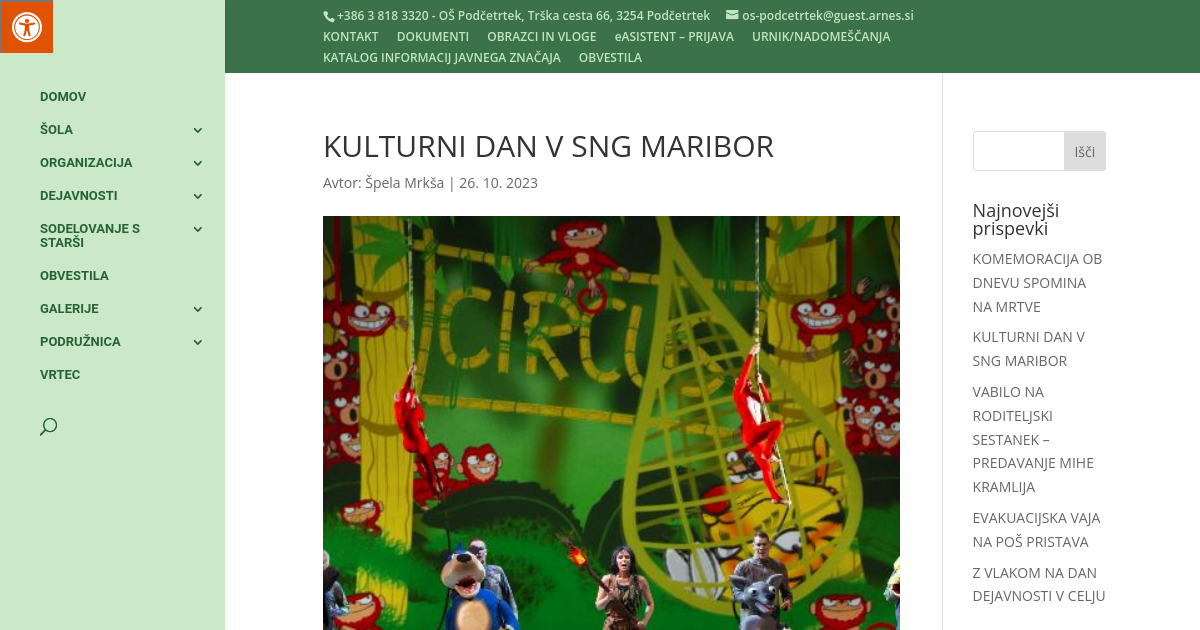 V četrtek, 26. 10. 2023, smo za učence šestih in sedmih razredov izvedli kulturni dan GREMO V GLEDALIŠČE – obiskali smo SNG Maribor, kjer smo si ogledali opero Knjiga o džungli. Gre za zgodbo pisatelja, Nobelovega nagrajenca Rudyarda Kiplinga, ki je znana mladim po vsem svetu. Knjižna izdaja enega najbolj znanih del za otroke sega v leto 1894 in od takrat do danes je Knjiga o džungli doživela številne knjižne, filmske, gledališke in animirane priredbe. V mariborski operi sta vznemirljivo pustolovščino dečka Mavglija in njegovih živalskih prijateljev ustvarila skladatelj Giovanni Sollima in libretist Pier Francesco Maestrini. Bilo je enkratno doživetje – zgodba, petje, ples, igra, orkester, animacija, humor, kostumi, luč, scena, posebni učinki … in sporočilo o življenju, svetu, ljudeh; toliko kot je namreč priredb te priljubljene zgodbe, toliko je najverjetneje tudi sporočil, ki jih Mavgli prinaša svetu.