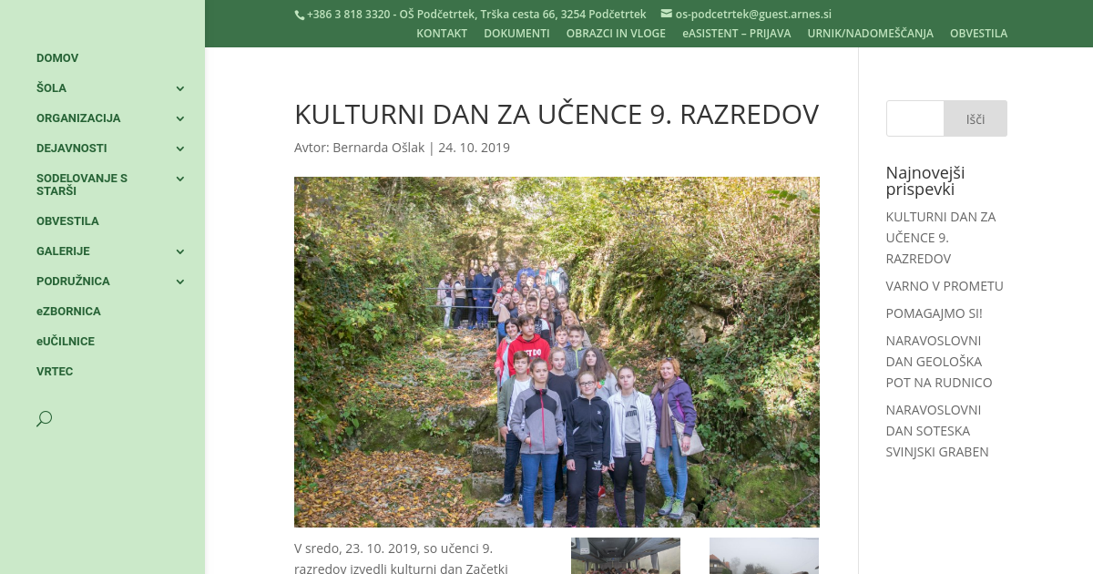 V sredo, 23. 10. 2019, so učenci 9. razredov izvedli kulturni dan Začetki slovenske književnosti na Dolenjskem in Krka. Tematika sovpada s praznikom dneva reformacije, saj so se učenci na svoji poti ustavili v Raščici, kjer so si ogledali spominsko sobo Primoža Trubarja, mlin in žago ter tako izvedeli veliko novega o načinu življenja ob koncu srednjega veka pri nas in o pomenu protestantskega duhovnika in avtorja prve slovenske knjige. V vasi Muljava so obiskali rojstno hišo slovenskega pisatelja in časnikarja Josipa Jurčiča in celoten muzej na prostem, ki je edinstven primer ohranjene slovenske domačije. Skozi dolenjske gozdove kraškega sveta so se peljali do vasi Krka, kjer so spoznali notranjost Krške jame tudi z značilnimi živalskimi predstavniki, ki živijo v njej.