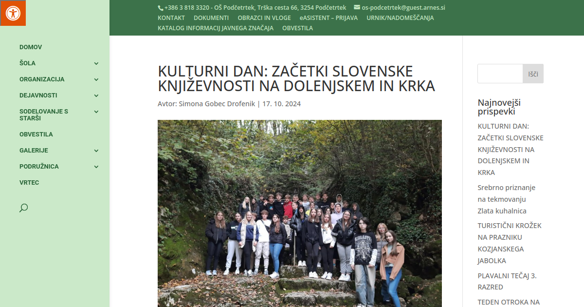 V sredo, 16. oktobra 2024, smo se učenci 9. razredov odpravili na Dolenjsko. Ogledali smo si Trubarjevo domačijo v Rašici in Jurčičevo Muljavo. Čeprav smo o Trubarju in Jurčiču že veliko znali, smo se kljub temu veliko novega naučili. Zelo zanimivo se mi je zdelo, da je Josip Jurčič že pri sedemnajstih objavil svojo prvo pripovedko Pripovedka o beli kači. Ali pa, da na Muljavi kar 300 let niso nobenega novorojenega dečka imenovali Primož. Ogledali smo si tudi Krško jamo, ki je občasni izvir Krke in v kateri živijo človeške ribice. Med vožnjo nazaj, smo se ustavili v večjem trgovskem centru pri Novem mestu. Na kulturnem dnevu smo uživali in se med seboj še bolj povezali.