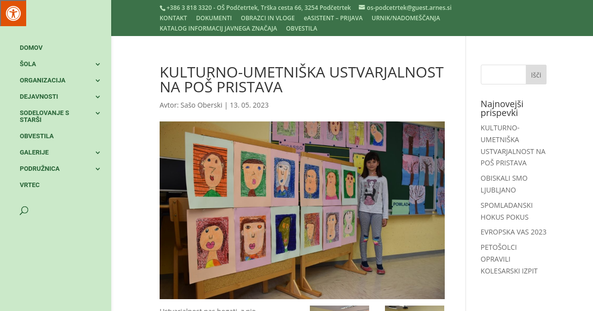 Ustvarjalnost nas bogati, z njo osebnostno rastemo in krepimo naša doživljanja, čustva in odnose do drugih. Z umetnostjo izražamo samega sebe in iščemo potrditev v družbi. Kultura in umetnost sta pomemben del vzgojno-izobraževalnih dejavnosti, saj učencem pomagata pri odkrivanju njihove ustvarjalnosti, odkrivanju njihovih čustev in občutij ter spodbujanju samozavesti ter samopotrjevanja. Na POŠ Pristava kulturi in umetnosti dajemo velik pomen skozi vso šolsko leto. Delček tega smo prikazali na prireditvi ter razstavi otroških likovnih izdelkov. Obiskali so nas tudi učitelji in učenci Erasmus programa iz Turčije. Hvala, da nas spodbujate na naši ustvarjalni poti.
