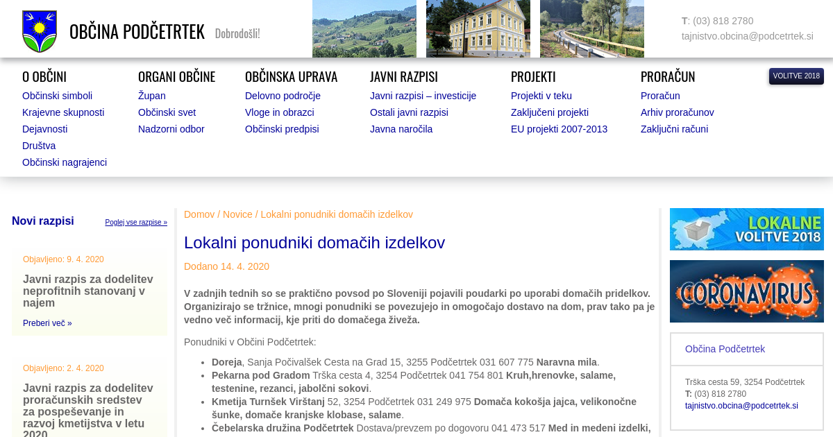 V zadnjih tednih so se praktično povsod po Sloveniji pojavili poudarki po uporabi domačih pridelkov. Organizirajo se tržnice, mnogi ponudniki se povezujejo in omogočajo dostavo na dom, prav tako pa je vedno več informacij, kje priti do domačega živeža. Ponudniki v Občini Podčetrtek: Doreja, Sanja Počivalšek Cesta na Grad 15, 3255 Podčetrtek 031 607 775
