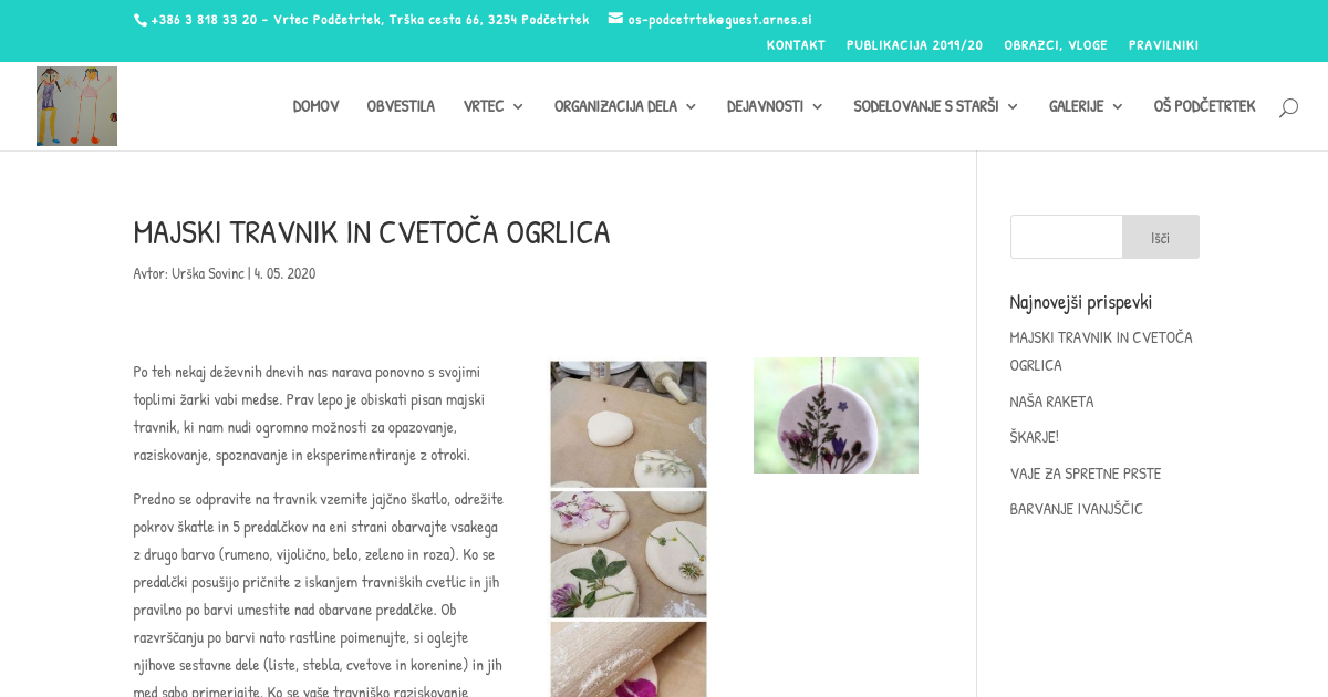 Po teh nekaj deževnih dnevih nas narava ponovno s svojimi toplimi žarki vabi medse. Prav lepo je obiskati pisan majski travnik, ki nam nudi ogromno možnosti za opazovanje, raziskovanje, spoznavanje in eksperimentiranje z otroki.