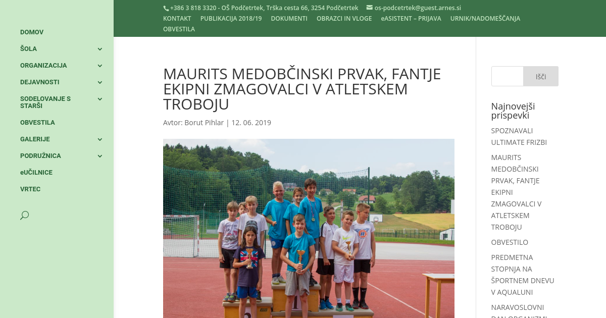 V torek 11. junija 2019 je na atletskem stadionu v Šmarju pri Jelšah potekalo medobčinsko tekmovanje v atletskem troboju za učence in učenke 4. in 5. razreda. Mladi atleti so se pomerili v teku na 60m, skoku v daljino in metu vortexa. Naša osemčlanska ekipa se je odlično odrezala. Maurits Schmit je prepričljivo postal medobčinski prvak, Jan Šelekar je s četrtim mestom za las zgrešil zmagovalne stopničke. Fantje pa so ekipno osvojili prvo mesto. Ekipo deklet so v večini sestavljale četrtošolke, ki bodo lahko še nastopale naslednje leto, ko bo tekmovanje v Podčetrtku.