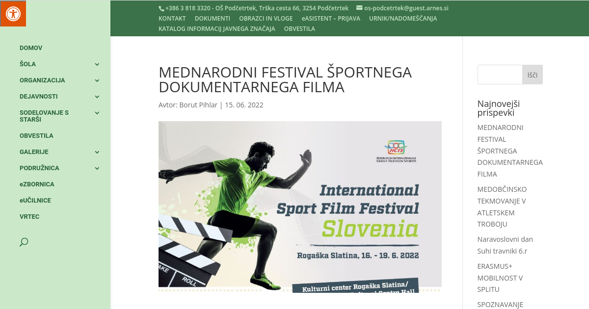 Rogaška Slatina od 16. do 19. 6. 2022 gosti mednarodni festival športnega dokumentarnega filma. Četrtek 16.6. in petek 17.6. sta namenjena ogledu dogodka osnovnošolcem in dijakom. Na povabilo organizatorja, se bodo tudi naši učenci udeležili tega dogodka. V petek 17.6.2022 ob 8:45 se bodo, učenci od 4. do 8. razreda matične in podružnične šole, odpeljali v Rogaško Slatino, kjer si bodo najprej ogledali dve razstavi namenjeni športu, se srečali z našimi športniki olimpijci, ter si ogledali izbran športni film. Povratek nazaj v šolo je predviden ob 12:30.