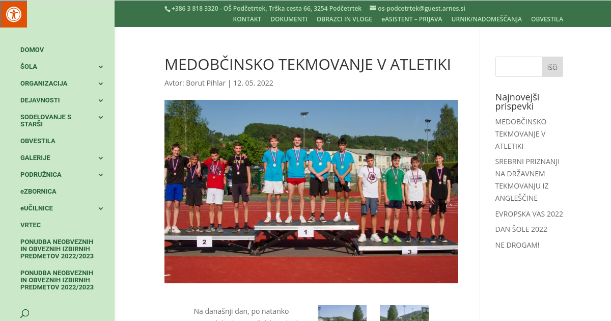 Na današnji dan, po natanko enajstih letih, se je šolska atletika vrnila v Kozje, kjer je pred tem domovala več kot dvajset let. Kozje je dobilo sodoben atletski objekt, ki ga je danes preizkusilo več kot 300 mladih atletov in atletinj iz osmih šol upravne enote Šmarje pri Jelšah. Prvič je bilo na našem medobčinskem tekmovanju izvedeno tudi elektronsko merjenje časov v tekih, kar je še močno dvignilo nivo samega tekmovanja. Naši atleti in atletinje so se odlično odrezali, postavljali nove šolske rekorde, izboljševali svoje osebne dosežke in osvojili kar 8 zlatih kolajn, 3 srebrne in 2 bronasti. Celotni ekipi iskrene čestitke.