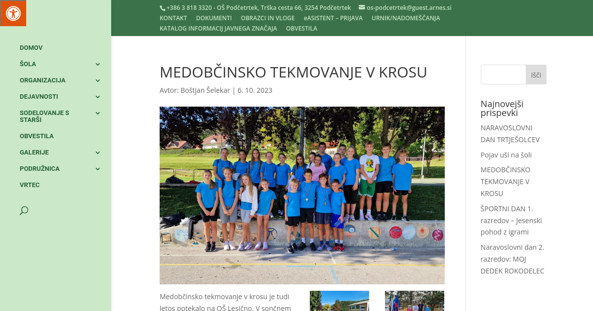 Medobčinsko tekmovanje v krosu je tudi letos potekalo na OŠ Lesično. V sončnem jesenskem vremenu so se mlade atletinje in atleti pomerili v teku na 1000 metrov. Z ekipo 23 učencev smo se tekmovanja udeležili tudi mi. Največ rezultatskega uspeha sta dosegla sedmošolec Benjamin Gajšek s 3. mestom in Tjan Jagrič, ki je postal medobčinski prvak. Oba sta se s tem uvrstila tudi na državno tekmovanje.
