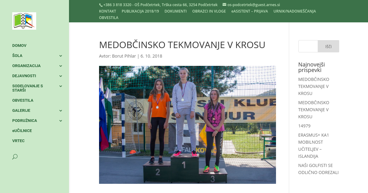 V četrtek, 4. oktobra, je v Lesičnem potekalo medobčinsko tekmovanje v krosu. Na tekmovanju je sodelovalo tudi 21 naših učencev in učenk v kategorijah od 6. do 9. razreda. Najbolje sta se odrezali Karmen Umek, ki je med devetošolkami osvojila 2. mesto in Ema Osojnik, ki je med sedmošolkami osvojila 3. mesto. Karmen in Ema sta se uvrstili na državno tekmovanje, ki bo v soboto 13. 10. v Mariboru. REZULTATI MEDOBČINSKEGA TEKMOVANJA V KROSU